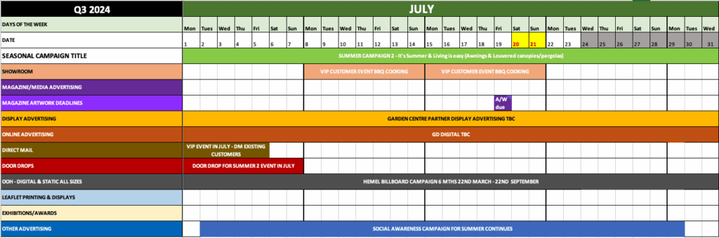 Once your research is complete, it’s time to plan. If you already have a marketing calendar, update it with your latest data. If not, create a visual plan in Excel or Google Sheets to map out activity month by month. See the example below.